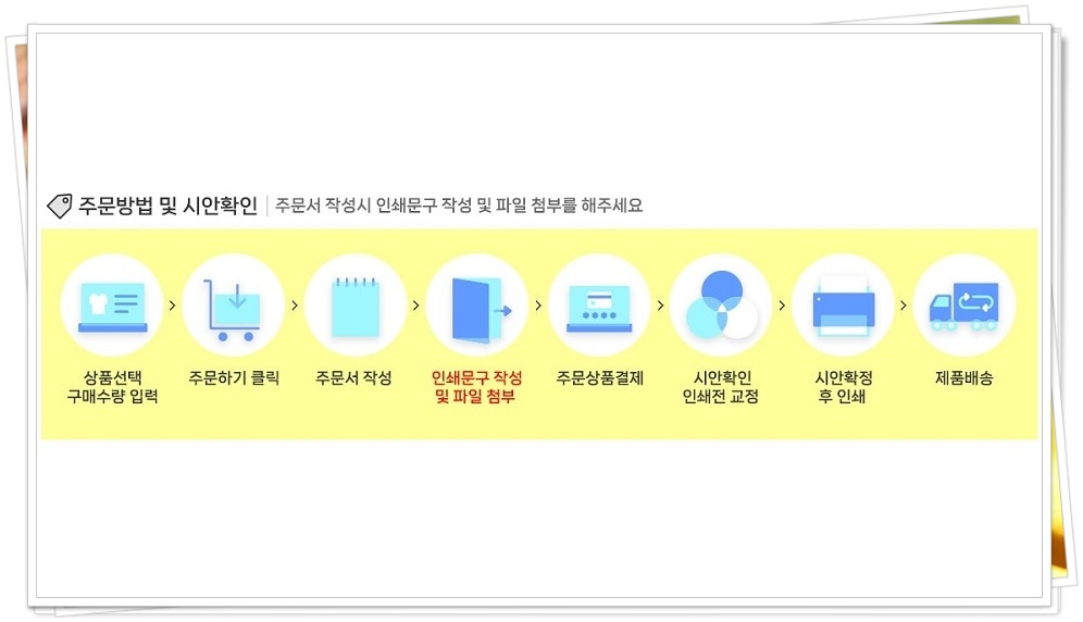 • 인쇄를 하시는 경우, 고객님이 보내주신 원고 및 도안을 기본으로 시안을 제작하고, 정확성을 기하기 위해 고객님과 재확인 후 제작이 들어갑니다.