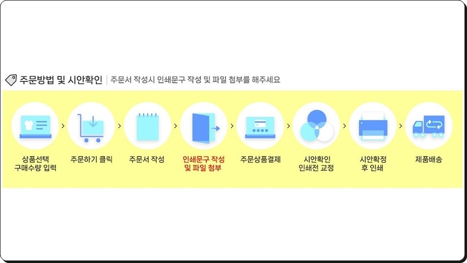 • 인쇄를 하시는 경우, 고객님이 보내주신 원고 및 도안을 기본으로 시안을 제작하고, 정확성을 기하기 위해 고객님과 재확인 후 제작이 들어갑니다.